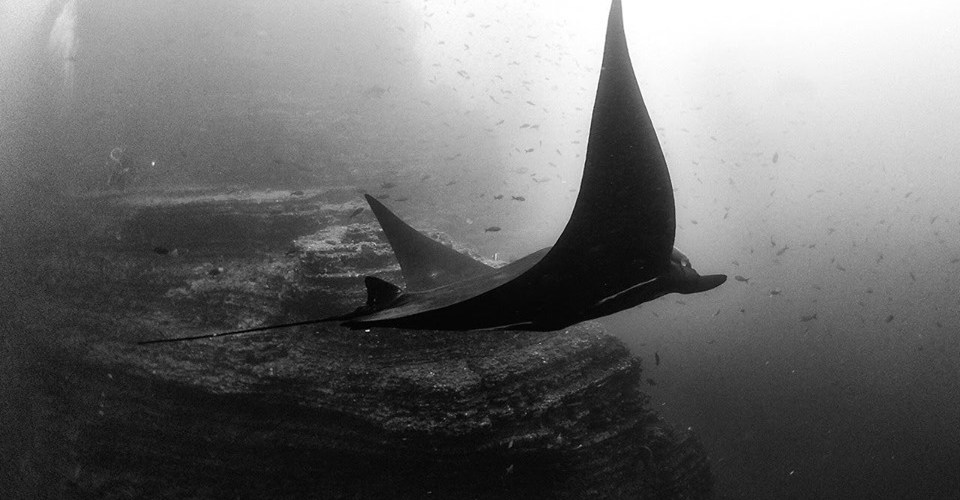Dronen siger en opvakt lyd. En gennemført designet lyd, ligesom Volvodøre hvis døre er manipuleret til at smække med en mere dumpt tilfredsstillende lyd. Sammen med det nu lysende blå robotøje, skal lyden signalere teknologisk beredvillighed. ”Klar til at tjene og underholde dig”, synes dronen at sige. Den er ikke mere end en halv meter lang og ligner mest af alt en håndholdt støvsuger. Eller en hvid robotudgave af de røde redningspontoner, der udgjorde Pamela Anderson og David Hasselhoffs vigtigste rekvisit til at illudere anden end pornografisk nytte i 90’er-serien Baywatch. Kasper venter til en af akvariets enorme ørnerokker passerer os med et par graciøse finnetag. Så kaster han dronen ud fra broen. Den synker retkølet og svagt boblende i oceantankens oplyste vand. Jeg betragter mig selv udefra og synes jeg ligner en idiot, eftersom jeg forsøger at holde rede i det 50 meter lange strømkabel. Selv støvsugere bruger ikke længere strømkabler. Samtidig holder jeg controlleren, der styrer dronen. På toppen af controlleren er en smartphone monteret. Via en app og sit eget lokale netværk transmitterer den et livestream fra et kamera indbygget i dronens front. Det er en bizar oplevelse at stå på broen og se dronen skyde gennem vandet på foranledning af min tommels vægt på piletasterne, og samtidig indtage dronens fiskeperspektiv, som ét blandt mange bevægelige legemer i de fire millioner liter summende saltvand. Ikke helt som jeg havde forestillet mig en ud-af-kroppen oplevelse ville være. Det er i sidste ende en skuffende oplevelse. Jeg sejler ind i en zebrahaj, der virker komplet uinteresseret i det adrætte plastikobjekt med den unaturligt lange hale. Kasper skærer en grimasse: ”Det siger vi ikke til dyrepasserne”. Hvad skal jeg nu? Styre dronen ned under koralklippen, der som en klatrevæg er dekoreret med farverige plastafstøbninger? Nej, så skal jeg kunne styre samme vej ud igen, for at ikke at forankre dronen med en ufrivillig sløjfe på ledningen. Oplevelsen kan selvsagt ikke måle sig med den totalsensoriske fryd, det er selv at dykke i tanken. Og jeg ville til enhver tid hellere styre en avatar gennem en fortryllende fiktiv verden foran computeren. Så hvad er formålet med undervandsdroner? Kasper giver mig ret i, at funktionen måske har overhalet formålet. Men der er uden tvivl et potentiale for forskningen og lammede meneskers adspredelse. På vej ned af broen rammes jeg af situationens absurde komik: Er dette virkelig vores idé om natur? Som formidlingsmedarbejdere på Danmarks Akvarium leger vi med fjernstyrede undervandsscootere i på et kunstigt indendørs rev et stenkast fra lufthavnens motorvejsafkørsel. Indopacifiske hammerhajer (Spyrhna lewinii) og sortplettede pigrokker (Taeniura meyeni)